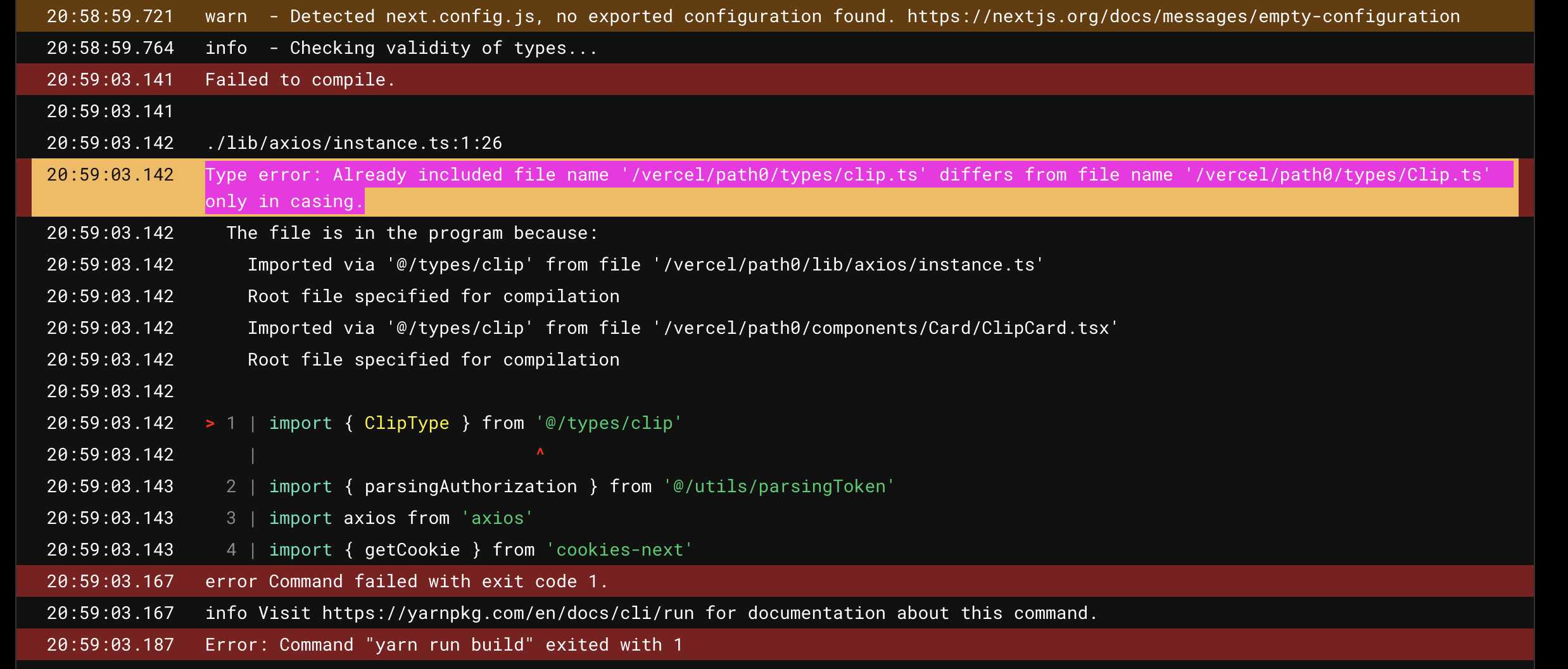 에러 메시지를 읽어보니 파일명과 관련한 이슈같아서 우선 로컬에 tsc 커맨드를 입력했을 땐 아무런 오류가 발생하지 않았다.