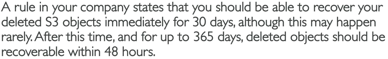 30일 이내엔 객체 삭제시 즉시 복구, 365 이내에는 48시간내에 복구할 수 있도록 설계