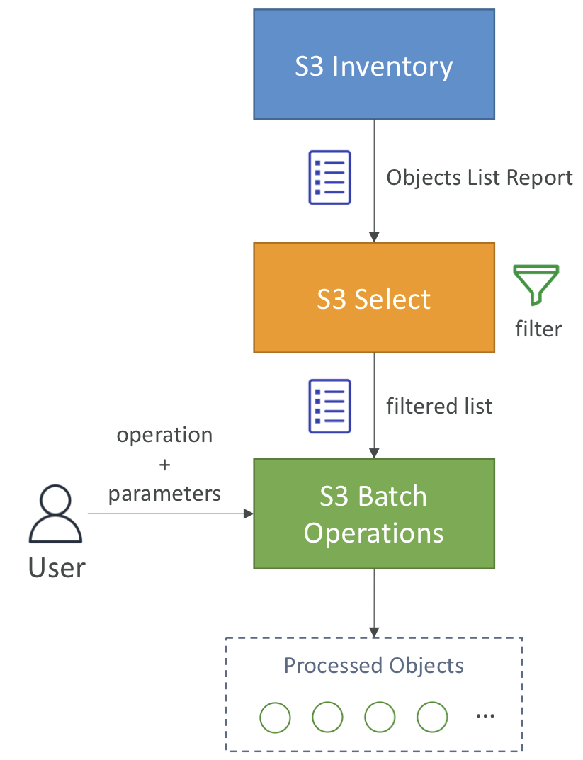 - S3 Inventory라는 기능을 사용해 객체 목록을 불러오고 Select를 사용해 객체를 필터링