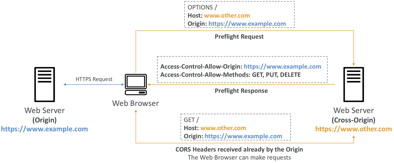 - 요청 프로토콜의 일부로 다른 웹사이트에 요청을 보내야 할 때 다른 오리진이 CORS 헤더를 사용해서 요청을 허용하지 않는 한 해당 요청은 이행되지 않는다