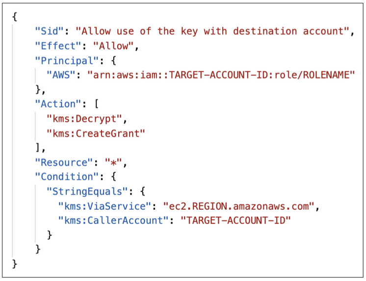 - 대상이 되는 키(Target Key)를 위한 KMS key policy를 적용해야함
