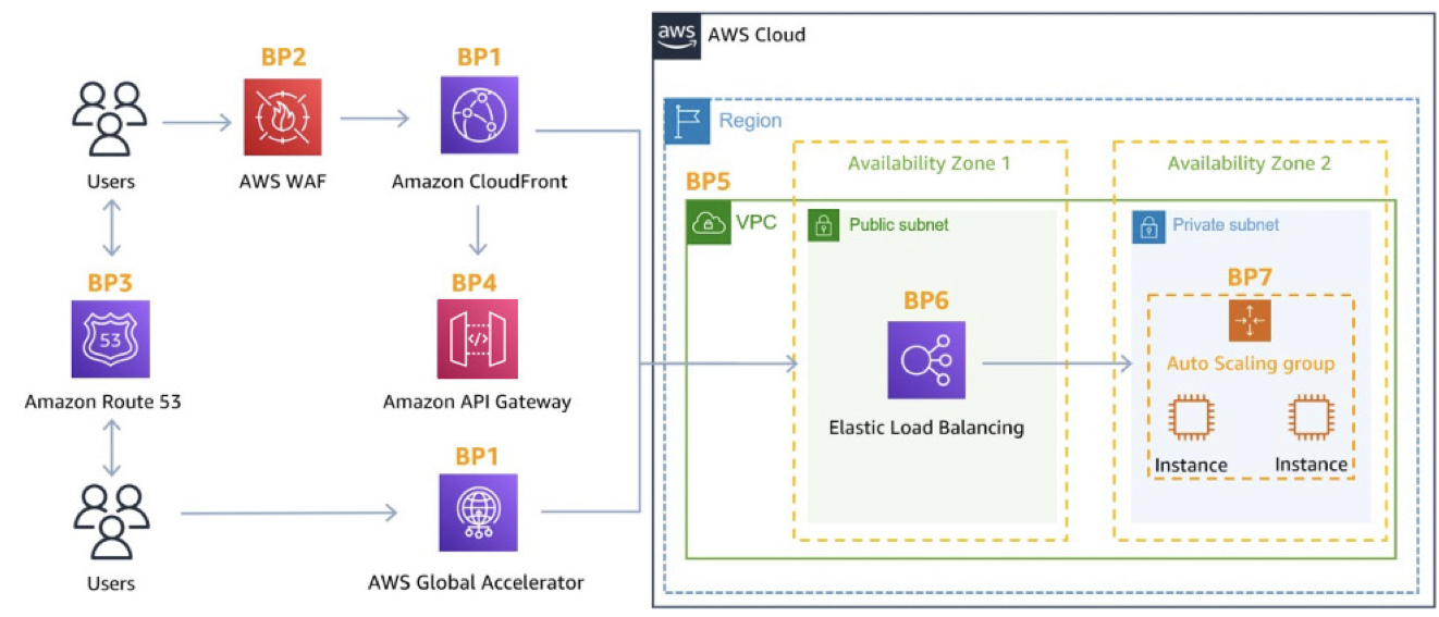 - 애플리케이션에서 사용되는 백엔드 AWS리소스는 사진 상 숨어있다(BP1, BP4, BP6)