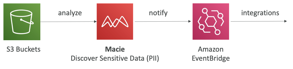 - 개인 식별 정보가 S3 버킷에 있는 경우 Macie가 이것을 분석하고 PII로 분류되는 데이터를 검색하여 EventBridge로 전달한다. 이후 SNS 토픽이나 람다함수에 통합 가능