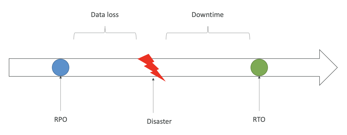 - RPO는 백업을 하는 시간을 1분 혹은 1시간 단위로 정한다면 이후 재해가 발생한 시간과 백업한 시간 사이의 데이터 손실을 얼마만큼 감수할지 설정