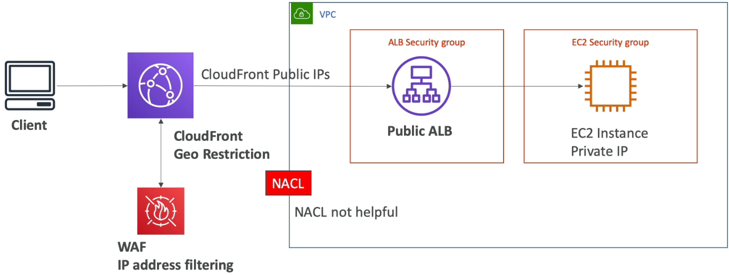 - CloudFront를 설치하는 경우 NACL은 더이상 도움이 되지 않는다(CloudFront 공용 IP가 전송)
