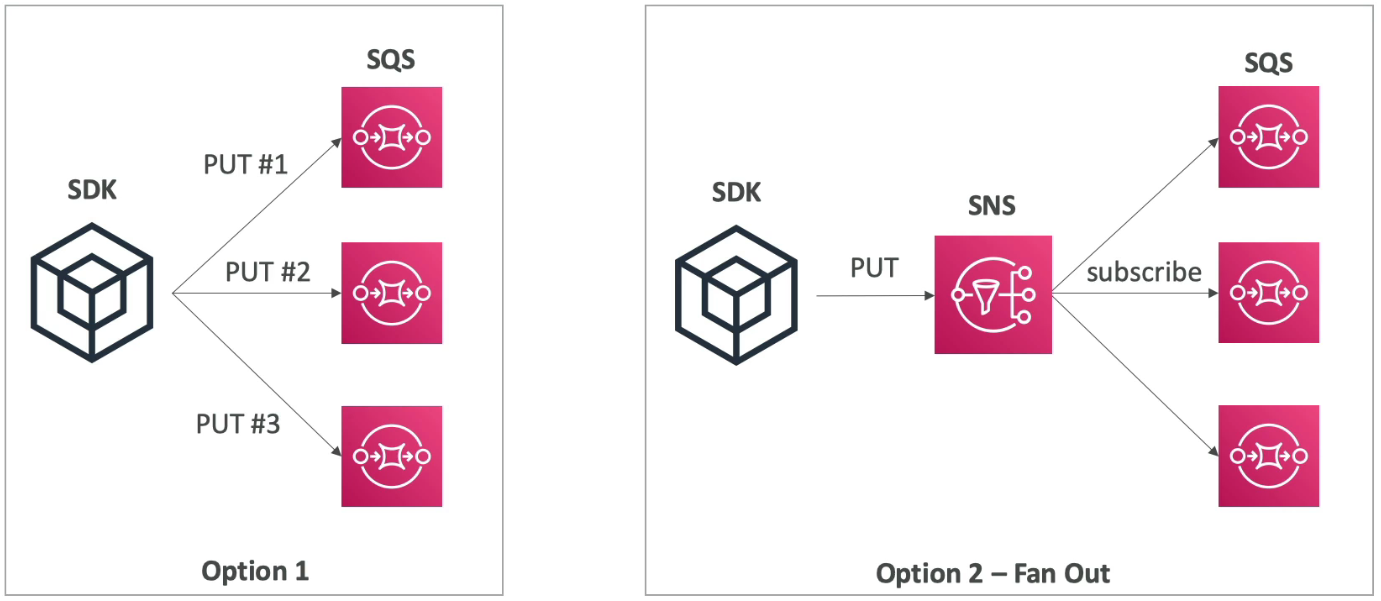 - SDK → 다중 SQS로 직접 쏘는 건 안정성이 떨어진다 (두 번째 큐에 전송하고 앱에서 오류가 발생하면 세 번째 큐는 메시지를 받지 못한다.)