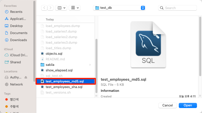 2. test_employees_sha.sql or test_employees_md5.sql 를 선택하여 테스트를 진행합니다.
