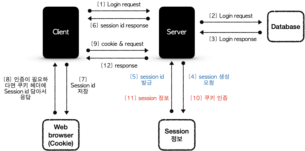 사용자(정확히는 브라우저)가 로그인을 하였다면 서버의 컴퓨터(세션 저장소)에서 사용자 정보(주로 브라우저에 쿠키에 저장하게 됩니다)를 확인한 뒤 확인 되었다면 일정시간 동안 유지시키며 이후 사용자가 서비스를 요청할 때 마다 세션 저장소에서 세션을 조회하고 작업을 처리하는 방식입니다.