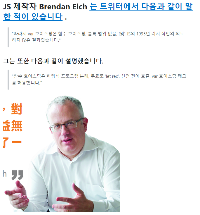 스택오버플로우에서 결국 JS개발자가 직접 의도하지 않은 결과라고 말을 하면서 결국 왜 호이스팅이라는 것을 발생시켰는지는 잘 이해할 수 없게되었다.